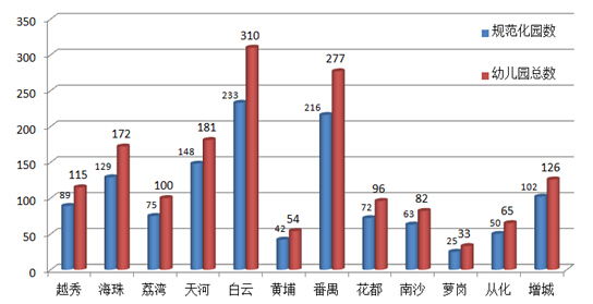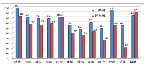 《广州市学前教育三年行动计划(2011-2013年)》提出力争2013年公办幼儿园占比达到30%以上的目标。各区(县级市)按照广州市公办幼儿园认定标准,认定、建设一批公办幼儿园,较好地实现了这一目标。2011-2013年全市公办幼儿园由原来250所增至531所,增加了281所。