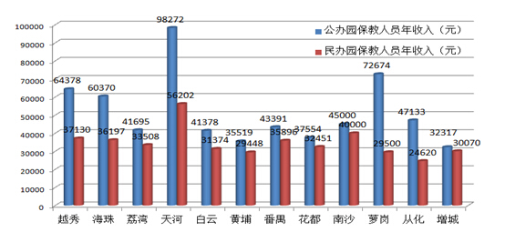 1.完善机制,分类解决并稳步提高保教人员的待遇。在保障公办园合同制教师待遇方面,海珠区设定公办园合同制专任教师和保育员的平均工资标准为每月4100元和3600元;天河区公办园合同制教师的工资由财政统一支付。在保障民办园教师待遇方面,番禺区规定省、市、区一级幼儿园、规范化幼儿园和未评级的普惠性民办园教职工平均工资不能低于当年广州市职工最低工资标准的3倍、2.5倍、2倍、1.8倍。黄埔区、荔湾区、白云区将教师待遇落实情况作为民办园年检内容,其中,白云区要求民办园在学期初把教师两个月工资存入工资专户,通过银行每月按时足额向教师发放工资,从制度上保障了民办园教职工的待遇。