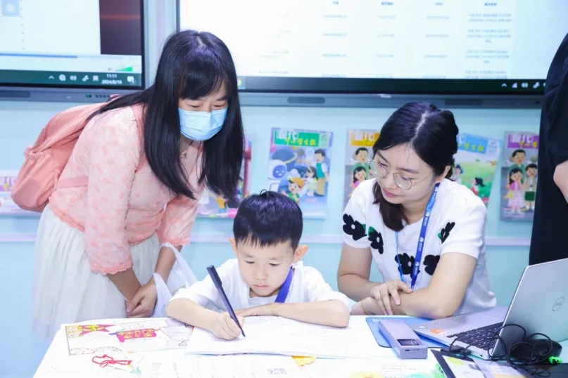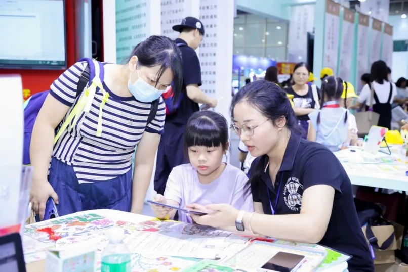 ▲学生与家长在展区体验广州市中小学智慧阅读平台设立的各项文化阅读体验活动。